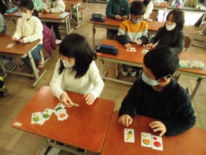 外国語活動「サラダで元気」では,サラダを作るために野菜の言い方を学習しました。ポインティングゲームや,集中力ゲームをしながら,楽しく活動しています。どんなサラダができるか,わくわくしますね!