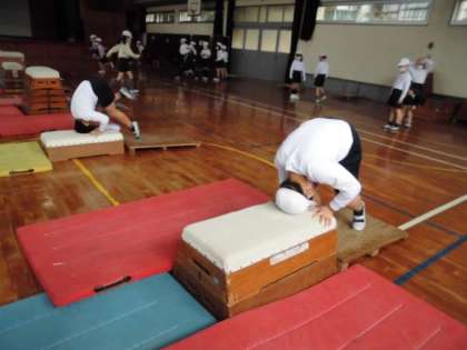 とび箱あそびの学習では,いろいろな高さに挑戦したり,少し頑張ればできそうな跳び方を練習したりしています。「もう少し手を前においてみようかな。」「力いっぱい踏み切ると,跳べたよ。」「前転がりにも挑戦してみよう。」と,子どもたちはアドバイスをし合ったり,友達のよいところを見つけたりしながら活動を楽しんでいました。