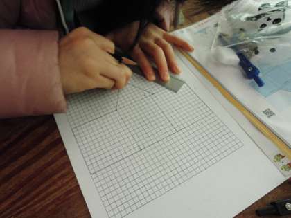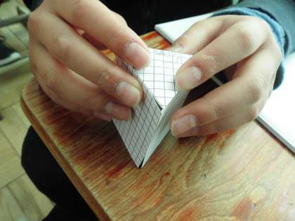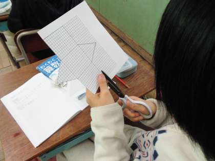 算数科「角柱と円柱」の学習で,角柱の展開図をかきました。底面の図形の辺と側面の辺の長さが同じになることに着目して作図を行うことが出来ました。実際にかいた展開図を切り出し,ちゃんと角柱になるかどうか確認をしていました。