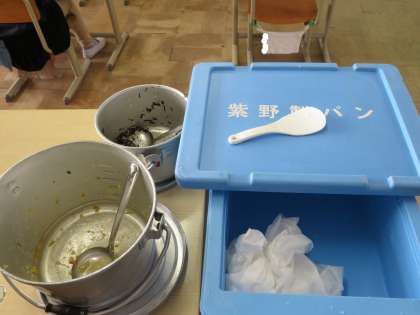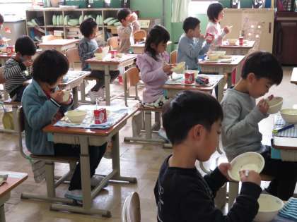 1年生 給食「あげたま煮・小松菜とひじきのいためもの」2組