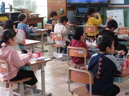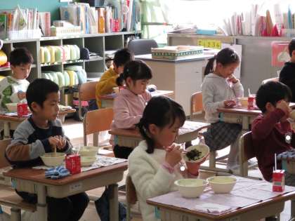 1年生 給食「あげたま煮・小松菜とひじきのいためもの」1組