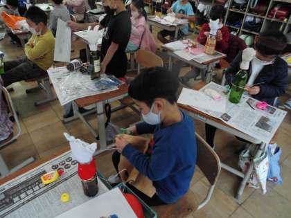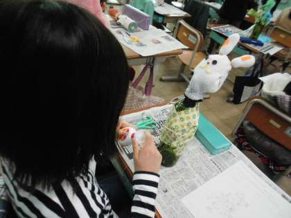 びん人形作りを進めています。動物の顔に見立てた軍手に,ボタンや毛糸で目や口をつけると,一気に華やかになりました。服にもこだわり,カラフルな布や画用紙を使って仕上げています。子どもたちは,「何だか,ライオンっぽくなってきたなぁ。」「お花屋さんがもっている花束を,ビーズで作ったよ。」と楽しそうに活動をしていました。