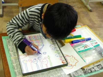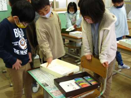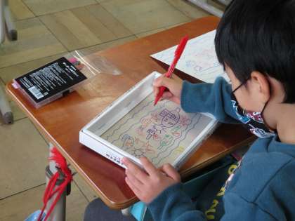 図画工作科では,「のってみたいな いきたいな」という題材で箱に絵を描いています。