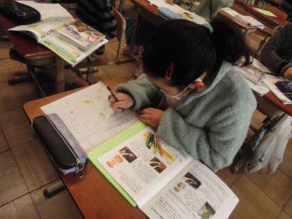 宇治茶について学んだことについてのパンフレットを書いています。今まで学習してきたノートや「わたしたちの京都」そして,「宇治茶大好き」という冊子を参考にしながらまとめています。宇治茶に携わる人々の思いや,自分が学習した感想も入れながら,一人一人がまとめ方を工夫して取り組んでいます。完成が楽しみです。
