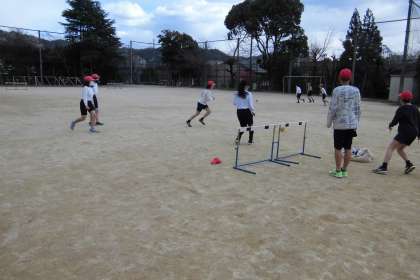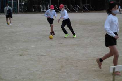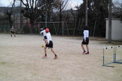 今日は,朝から雪が舞う寒い1日でした。7時間目の体育の時間,雪は降っていないものの,寒い・・・。今回は,2人対2人以上でゲームをすることができません。3〜4人チームの中で,2人ずつゲームに参加するので,審判・応援の時間があります。「今や!蹴って!蹴って!」「ナイス!」「走れ〜」など,自分のチームを大声で応援する姿が見られました。チームは毎時間変えています。誰と同じチームになっても,声を掛け合い,仲良く楽しそうにゲームをする姿を見ていると,温かい気持ちになります。