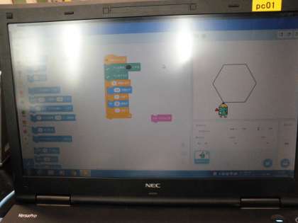 算数科「円と正多角形」で学習したことを生かして,プログラミングを使って正多角形をかく学習をしました。正多角形がもつ要素を細分化・分解して考え,それぞれの命令に反映していきます。
