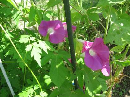 フウセンカズラに混じって咲いているアサガオも,新色がお目見えです。つぼみもたくさんできていて,見るたびに目を楽しませてくれています。