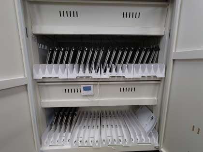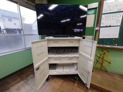 放課後に,大型テレビ(モニター)、保管庫の設置が完了し,教室にタブレットが配備されました。今朝,教室に入ったときに目に入るTVの大きさにみんな驚いていました。 今後,学年に応じて,タブレットを活用して学習に活かしてく予定です。