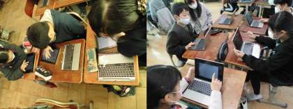算数科の学習では,複雑な図形の面積を求めるために,図形に直接線を引いたり式を書いたりして考えを書き込みました。その考えを友達に送ることで,グループ学習でもほかの人の考え方に触れやすくなりました。国語科の学習では,自分が提案したい事柄についての現状を調べるために,アンケートを作成してクラスのみんなに配布したり,インターネットで調べたりしました。外国語科の学習では,自分のあこがれの人を紹介するカードを作成しました。係活動では,アンケートを作成して配布したり,係活動に必要な情報を集めるために調べたりしました。今後もプレゼン資料の作成や,考えを共有するツール,プログラミング学習などに活用していこうと考えています。