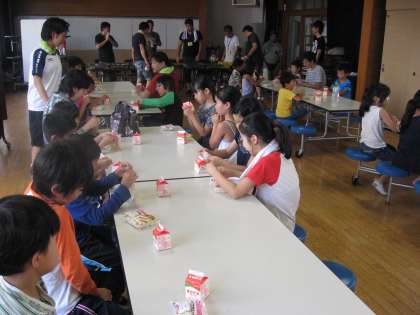 朝食は,パンと牛乳をみんなで食べました。