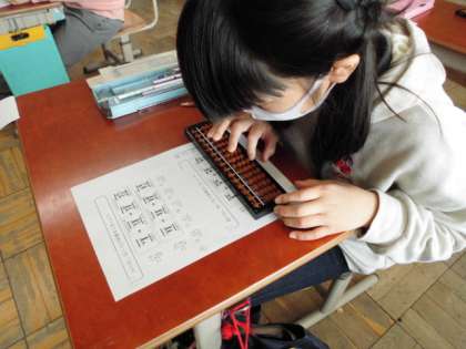 算数科では「そろばん」の学習に取り組んでいます。一人一人がそろばんを操作しながらいろいろな計算に挑戦しています。14+31や85−61の計算では,「あれ,これ以上入れられない。」「どうしたらいいのかな。」とみんなで考えながら,入れ方やはらい方を確認しました。子どもたちは真剣な表情で取り組み,5の合成や分解は難しいですが,少しずつ慣れていきました。
