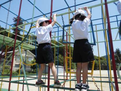 ゆうぐあそびでは,自分や友達の体を守りながら遊ぶ約束を確認したあと,総合遊具の1階に上ってみました。「ちょっと怖いけど,楽しい!」「いろいろな遊び方があるね。」と,初めての総合遊具に子どもたちは大喜びでした。また晴れた日に,ゆうぐあそびをします。休み時間に遊べる日が待ち遠しいですね。