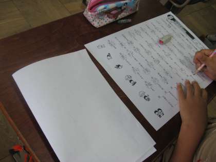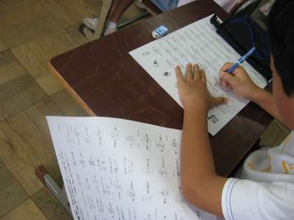 台風の影響が出始めているのか,外は,雨が降って木々の枝が揺れ始めている中,黙々と漢字プリントに取り組んでいる4年生の姿がありました。