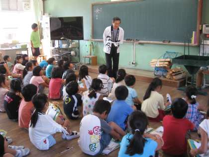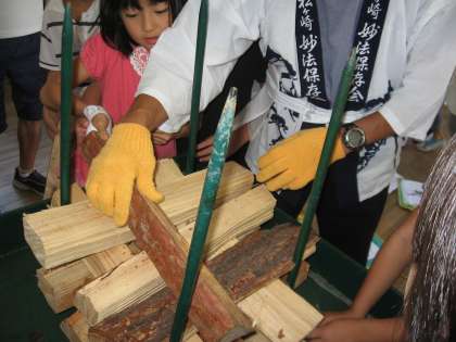 法の山の送り火を長年受け継いでおられる地域の三宅さんをお迎えして,今年の送り火の準備や当日の様子,苦労や願いについて,お話をうかがいました。実際にまきを背負わせてもらったり,持ってきていただいた火床にまきをくべさせてもらったりしました。