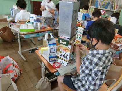 机の上に箱を出し,積み上げたり並べたりしていくと「恐竜が作れそう!」「丸い箱は,タイヤになりそうだな。」と,アイデアがどんどん広がりました。テープや接着剤を使い,楽しみながら作品を作ることができました。