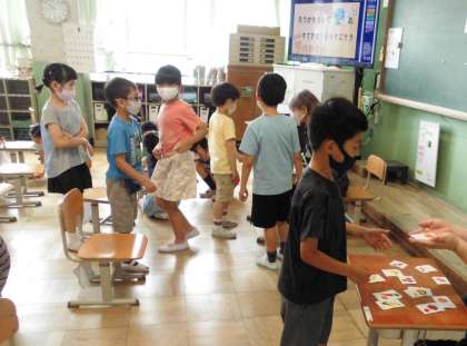 「I want 〜.」と新しい表現を使って,先生が開いた八百屋に来て,ほしい野菜を貰うというやり取りができました。そして,オリジナルのサラダ作りをみんなで楽しみました。