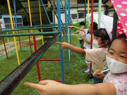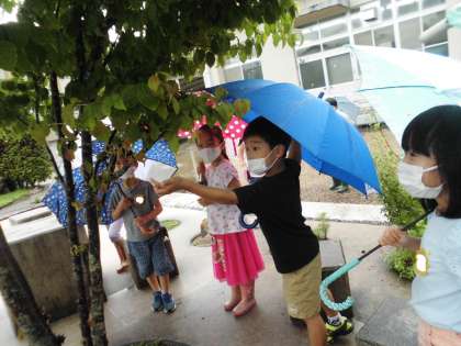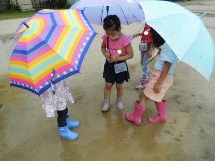 生活科「なつだとびだそう」の学習で,雨の日の様子を見ようという体験をしました。小雨でしたが,晴れている日と雨の日の違いを見つけたり,雨の音に耳を傾けたりして活動を楽しみました。「水たまりに自分がうつってる!」「くもの巣に,しずくが付いていてきれい。」などと,たくさんの発見がありました。
