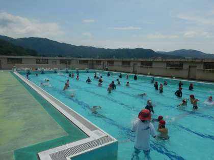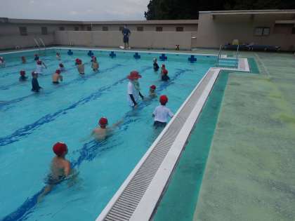 前回の水泳学習は雨でプールに入ることができませんでしたが,今日は天気が良い中入ることができました。1時間目の途中に雨が降り出しましたが,3時間目のときには雨も止み子どもたちの願いが通じました。ソーシャルディスタンスををとりながら,宝探しも行いました。