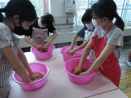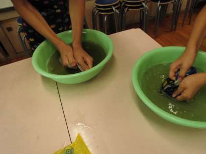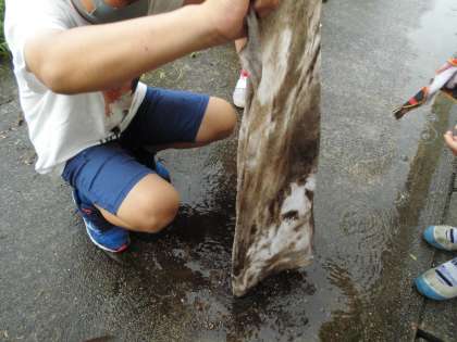 今日は「手洗い」で洗濯をしました。持ってきたタオルを泥や土で汚し,洗剤を入れた水につけ,ごしごしと洗いました。なかなか思うように汚れが落ちないところもありましたが,それも含めてよい経験になりました。