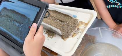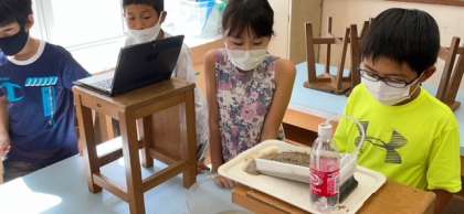 理科「流れる水のはたらき」の学習で河川を再現した流水実験を行いました。流れる水にはどのような働きがあるのか,1川岸を削る 2ものを動かす 3土地をつくる の3つの視点に絞って実験・観察をしました。タブレットを活用して実験前・実験後の写真を撮り,水を流している様子を動画に取ることで記録を残していました。今後,流す水の量を増やしたり,川を曲げたりしてどのようにはたらきが変化するか実験します。