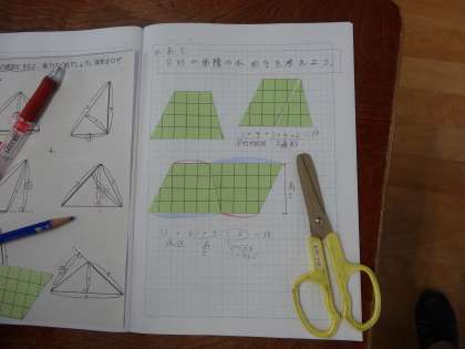算数で,面積の学習をしています。最初から公式を学ぶのではなく,知っている知識を使って,求める方法を考えていきます。今日は,台形の面積の求め方をやりました。三角形や平行四辺形の面積を求める公式はもう学習しているので,それらを使って考えていきます。二つ並べて平行四辺形を作ったり,変形・分割して三角形を作ったり…。式に表して整理してみると,どれも,(上底+下底)×高さ÷2になりました。驚き!!自分たちで公式を作り上げたような感覚で,すっきりした1時間でした。