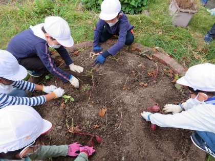 土の中でサツマイモがどれくらいになったか,わくわくしながら掘っていました。