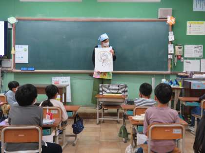 給食時間の終わりに,「たべもののたび」という紙芝居で