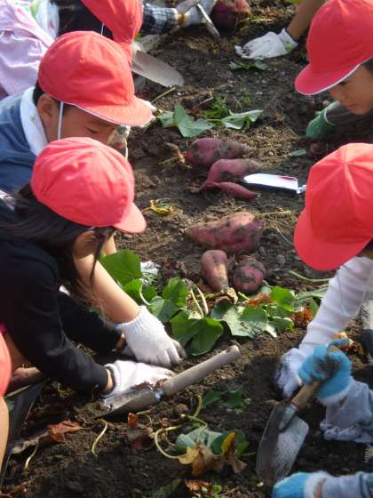 おいもさんに傷をつけないよう,しんちょうに掘り進めます。大きなおいもさんを掘り当て,思わず顔がほころびます。