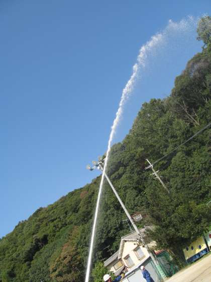 松ヶ崎消防分団には,毎分500リットルの水を放水できるポンプがあるということで,それを使った実演です。