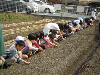「自分で種をまいた菜の花で漬けた菜の花漬けはおいしいよ!」とお話ししていただいて,「じょうずにまこう!」とどの子もがんばりました。