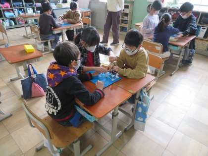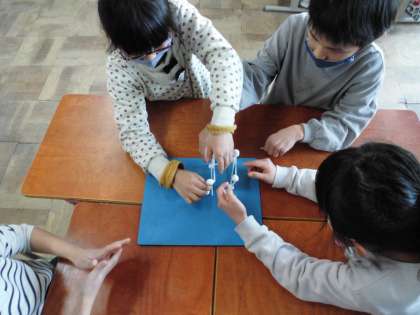 教科書の箱の形の絵を見て,何センチのひごが何本必要か,ねんど玉が何個必要かを考えました。そして,グループではこの形を作りました。「ここを抑えておくよ!」など声をかけながら協力することができました。
