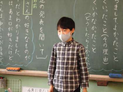国語科で「詳しく,具体的に伝わる自己紹介」について考えました。今日は,クラスの友達に向けて自分で考えた自己紹介をしました。