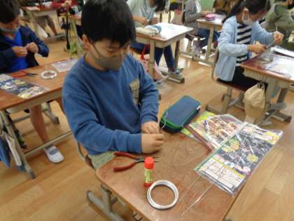 ワイヤーの曲げ方,切り方を学習した後,何かに巻き付けてコイル状にしたり,ワイヤーをつなげたりして自由に作りました。
