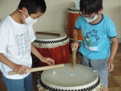 音楽室で,大だいこや和だいこ,トライアングルなどの音を出し,