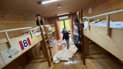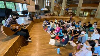 寝具準備をしてから、オリエンテーションホールでキャンプファイヤーの歌練習です。