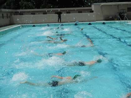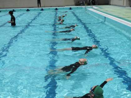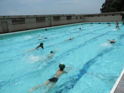今日から6年生の水泳学習が始まりました。まず初めに,水慣れをし,背浮きや浮き沈みをしながら,いざという時に自分の命を守るための安全確保につながる運動を行いました。その後は,泳力別に自分のペースで泳ぎました。暑い中,とても気持ちよさそうに学習していました。