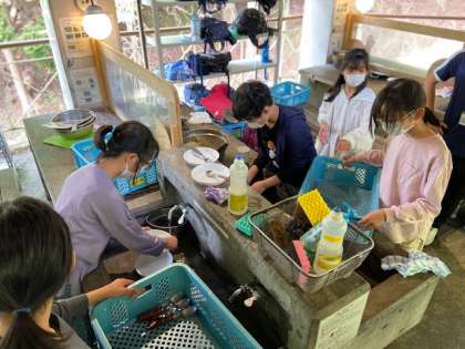 野外炊事の片付けをしています。