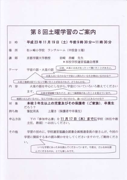 下の写真は読み取りにくいと思います。右列の<お知らせ>の項の「第8回土曜学習のご案内(宇宙の話・火星の話)」をご覧ください。