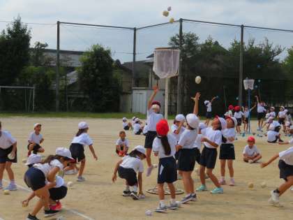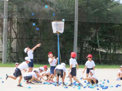 籠をねらって玉を投げますが、なかなか思い通りには入りません。