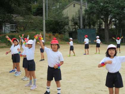 いよいよ運動フェスティバルまであと2日です。今日は腕に花輪をつけながら、本番通りに練習をしました。