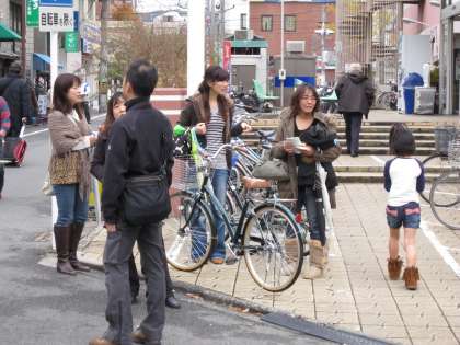 高野のスーパーマーケット前でウェット・ティッシュを配布しながら,