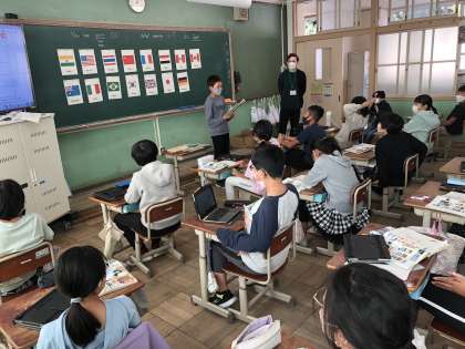 5年生の外国語では、行きたい国やそこでできることを紹介する学習をしています。今日は、お気に入りの国を選び、調べたことをもとにクイズを出し合いました。