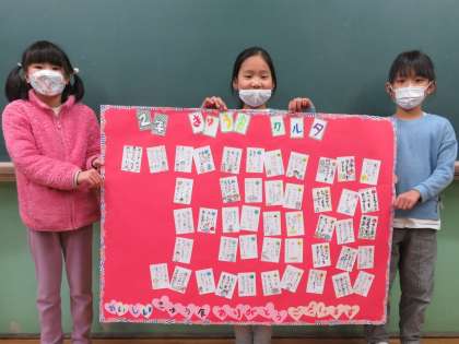 給食に関わっておられる方々への感謝の気持ちや好きな献立について、カルタに絵と文で表しました。