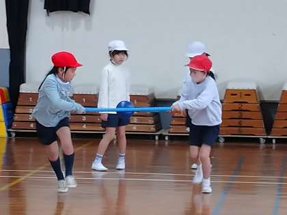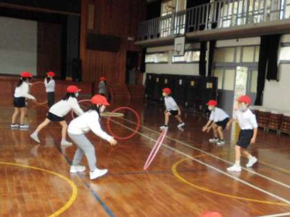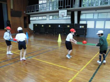 棒でボールを挟み、落とさないように進んだり、フープを転がしキャッチしたり、フープの中に入って進んだり…