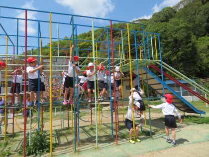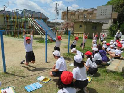 今日は、体育科の学習で鉄棒遊びをしました。鉄棒にぶら下がったり、足をかけたりしながら、自分の体を支える活動をしました。総合遊具の遊び方もおさらいし、柱のつかみ方や足の置き方など細かく確認していきました。これからも、総合遊具での遊びを授業で取り入れ、2階まで登り、すべりだいができるようにしていきたいです。