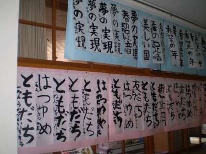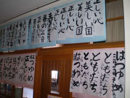 14日(土)の「お正月を楽しむ会」での書き初め作品が,中校舎1階ランチルーム前廊下に掲示してあります。