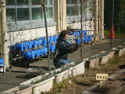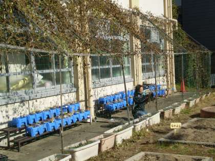 南校舎の南側で目立ちにくい所で,黙々と管理用務員がツルを取り除いています。