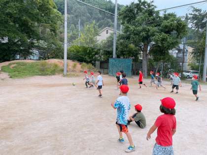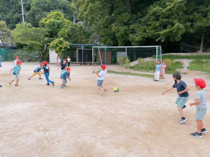 休み時間には運動場で、1組2組いっしょになって、楽しく遊んでいます。ドッジボールをして遊んだり、鬼ごっこをしたりして遊ぶことが多いです。ドッジボールでは、少しずつ速いボールを投げられるようになったり、キャッチできるようになったりしています。いつも白熱した勝負が繰り広げられています。
