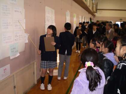 生徒がかねて<チャレンジ体験>でお世話になった事業所等での体験をもとに,問題を見つけ,調査・考察を加えて,結論を導いたことを模造紙にまとめ,それを提示しながら発表するというものです。