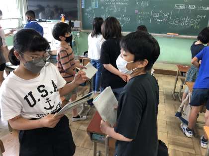 6年生の算数では、分数÷分数の学習を始めています。今日は式の立て方について考えました。分数であっても、整数や小数のときと同じように式を立てることができました。一人ひとりが式の立て方について説明する活動もしました。